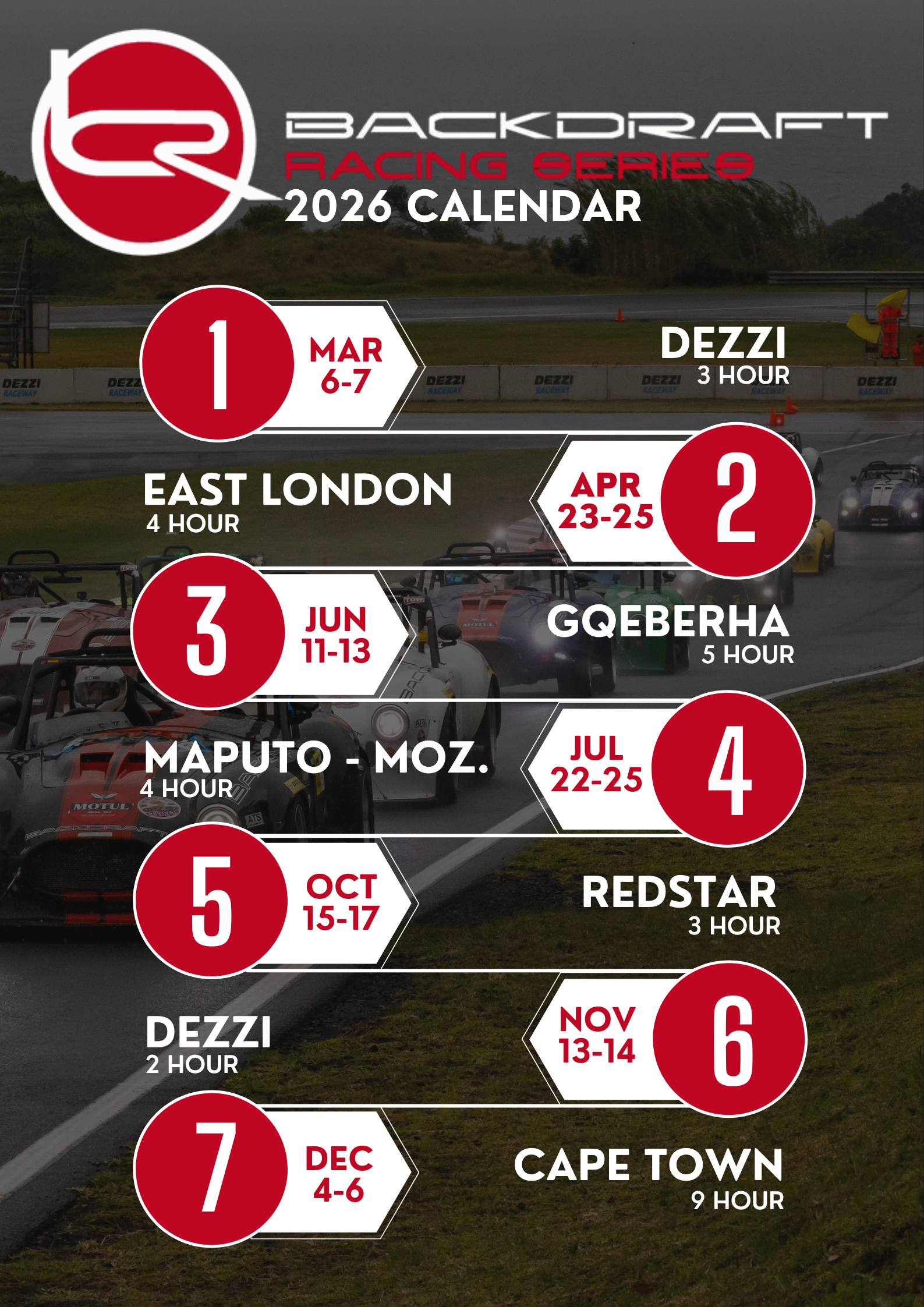 Our 7 endurance race calendar comprises of a mix of, 2, 3, 4 and 9 hour events. We visit 6 different circuits and one international event in Mozambique.